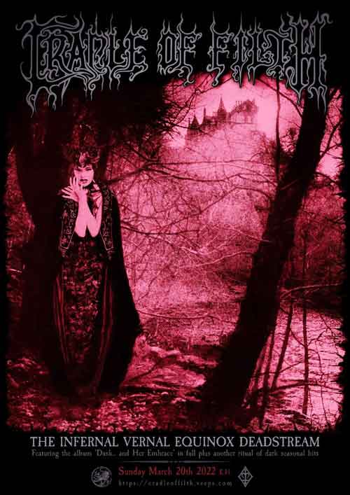 I Cradle Of Filth annunciano uno spettacolo in streaming che sarà intitolato “The Infernal Vernal Equinox”. Il concerto sarà tenuto proprio il giorno dell’equinozio di primavera ovvero il 20 marzo e durante il quale la band suonerà interamente l’album “Dusk… and Her Embrace”, un album del 1996