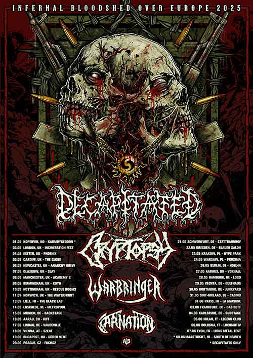 I Cryptopsy saranno in tour con i Decapitated, headliner, Warbringer e Carnation tra il primo giorno di maggio e l’8 giugno. Il tour “Infernal Bloodshed Over Europe 2025” passerà anche per l’Italia. Milano e Bologna, rispettivamente, il 5 e 6 giugno, al Legend Club e al Locomotiv.