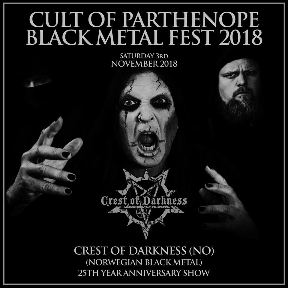 L’altra band annunciata sono i Norwegian Black Metallers CREST OF DARKNESS (NO), giunti al loro venticinquestimo anniversario, che festeggeranno con l’uscita di un nuovo album per l’etichetta italiana My Kingdom Music ed uno show speciale al Cult Of Parthenope Black Metal Fest 2018.