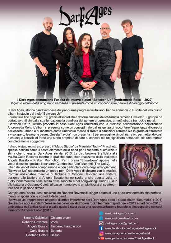 La prog band veronese dei Dark Ages, annuncia oggi l’uscita del nuovo album intitolato “Between Us”. Il disco, quinto della band, verrà pubblicato il 19 maggio 2022 dalla Andromeda Relix e sarà un concept sulle paure e il coraggio dell’uomo.
