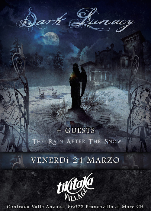 Continua il tour dei DARK LUNACY a supporto del nuovo album The Rain After The Snow! Dopo il release party di Bologna e il ritorno della band a Roma, Mike Lunacy e soci arriveranno Venerdì 24 Marzo al TikiTaka Village di Francavilla, provincia di Chieti! La nuova line-up che vede Jacopo Rossi al basso, Mirco Binda alla batteria e Davide Rinaldi alla chitarra sta proponendo uno show di grandissimo livello, in grado di portare sul palco il sound sinfonico e drammatico che ha da sempre caratterizzato la band.