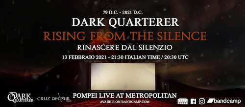 Il 13 febbraio i Dark Quarterer diffonderanno l’esecuzione dell’intero album “Pompei” eseguita nel Teatro Metropolitan di Piombino. L’iniziativa della band è volta a sostenere il Metropolitan, chiuso da mesi come altre strutture del genere nel nostro paese a causa della pandemia da Covid-19. Il 13 febbraio i Dark Quarterer diffonderanno l’esibizione attraverso la propria pagina Bandcamp, QUI, accessibile attraverso un contributo minimo di 5€ e tutti i proventi saranno destinati al Metropolitan.