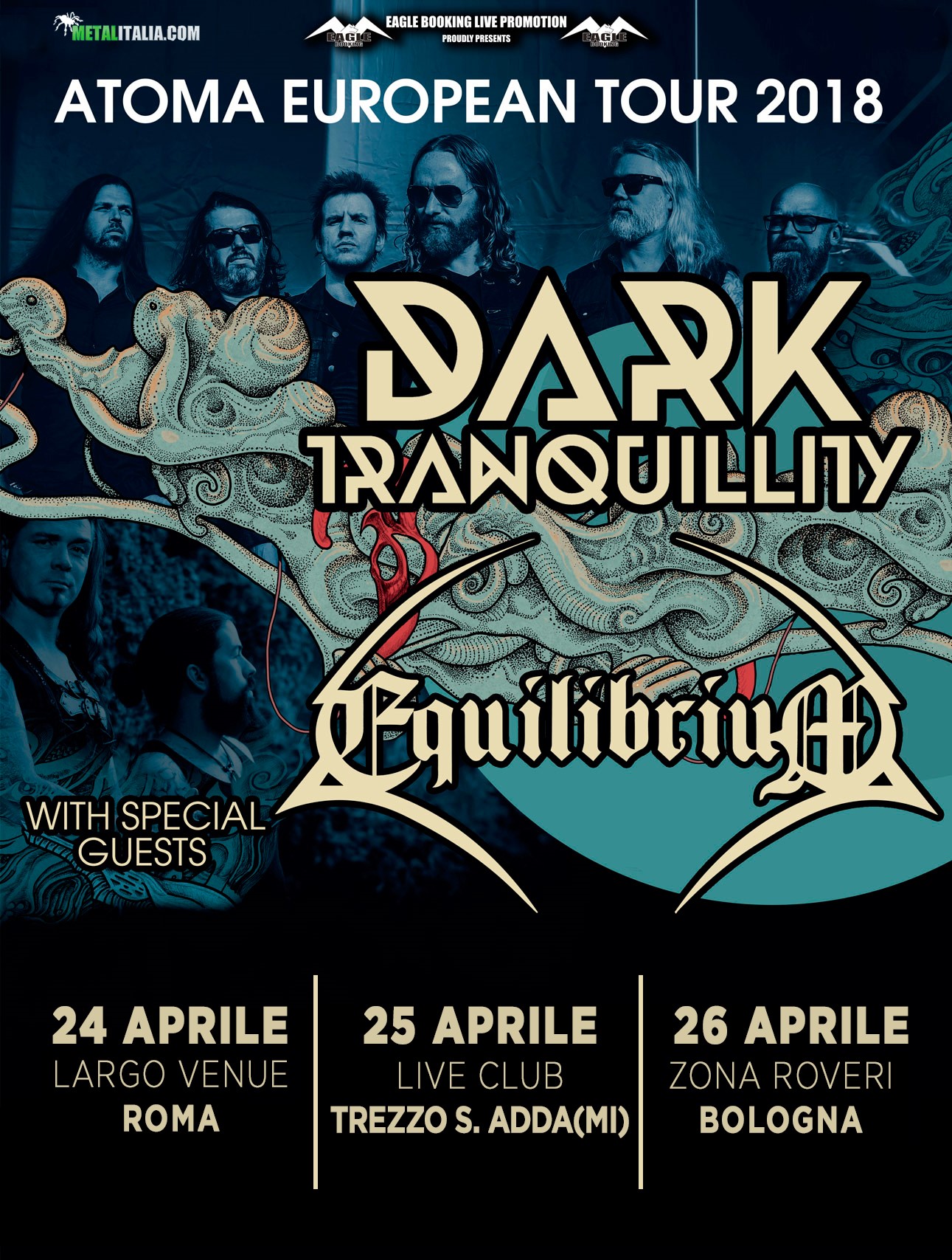 I DARK TRANQUILLITY tornano in Italia per tre nuove date da headliner! I cinque svedesi proseguono la loro marcia sulla spinta dell’ultimo e apprezzato album “Atoma” e nel 2018 passeranno nuovamente nel nostro paese con un tour che li vedrà affiancati dai tedeschi EQUILIBRIUM più due altri special guest che verranno resi noti a breve.