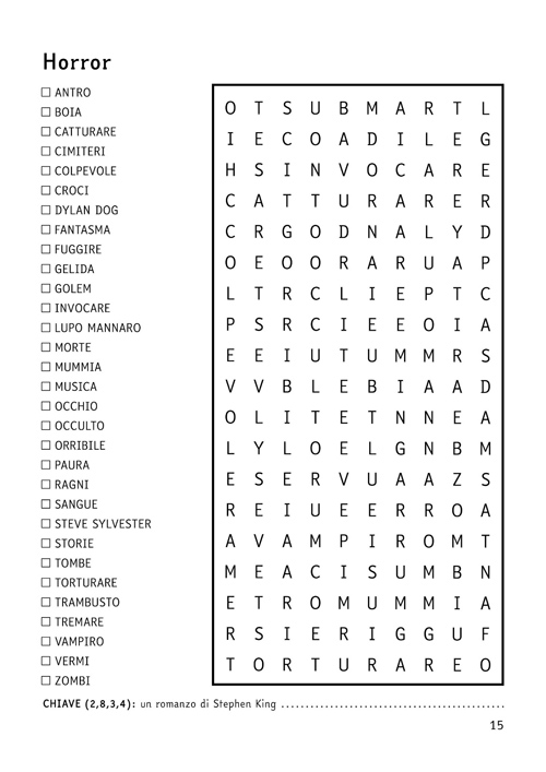 A pagina 15 c’è un quiz che si ispira a tematiche horror, per scovare il titolo di un romanzo di Stephen King. Il gioco cita anche il mitico Steve Sylvester, leader dei DEATH SS, e per rimanere nel tema scenografico della band, non mancano Boia, Morte, Vampiri, Lupi Mannari, Mummie, Zombi… riassumendo sostanzialmente gli storici ruoli interpretati dai membri della band!