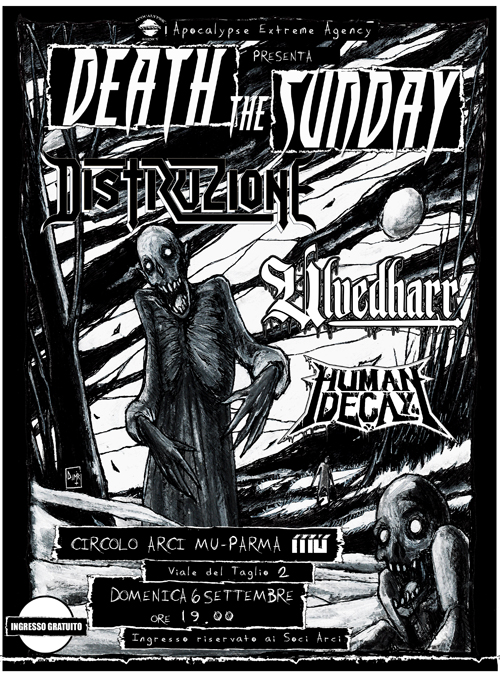 Apocalypse Extreme Agency, in collaborazione con Mu Live, sono lieti di presentare DEATH THE SUNDAY FEST.Domenica 6 settembre, a partire dalle ore 19:00, on stage da Modena gli HUMAN DECAY, con il loro thrash/death al fulmicotone. Dopo di loro, saliranno sul palco i deathsters ULVEDHARR, con il loro stile inconfondibile, ritornano in terra emiliana dopo mesi di assenza, per uno special show dedicato. Il compito di chiudere la kermesse è affidato ai DISTRUZIONE, che metteranno a ferro e fuoco il palco del Circolo Mu.