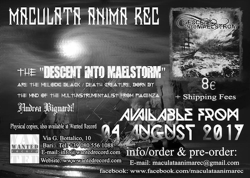 Il progetto Melodic Death/Black Metal guidato da Andrea “Maelstrom” Bignardi, Descent Into Maelstrom, ha firmato un contratto con Maculata Anima Rec per la versione in CD dell’omonimoo lavoro d’esordio uscito in formato digitale lo scorso marzo. Il disco sarà disponibile a partire dal 4 Agosto scrivendo a maculataanimarec@gmail.com.