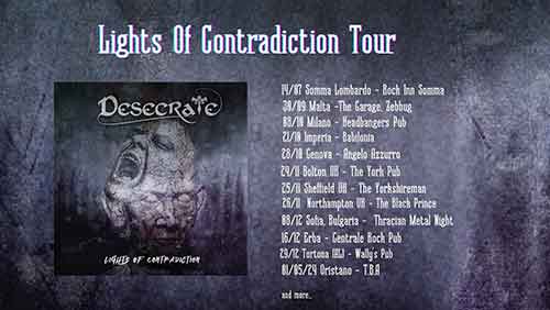 I Desecrate, melodic death metal, proseguono il tour europeo a supporto del quarto album “Lights Of Contradiction”. La band lo ha pubblicato il 9 giugno 2023 per Sleaszy Rider Records. Dopo tre date italiane e una a Malta, i Desecrate saranno sabato all’Angelo Azzurro della loro Genova per poi varcare i confini nazionali.