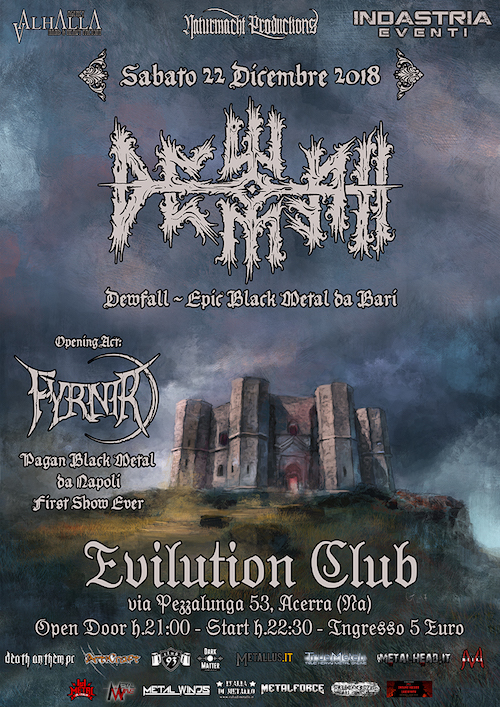 Hanno da poco pubblicato su Naturmacht Productions il nuovo album “Hermeticus”, concept album ispirato al mito estoerico di Federico II di Svevia ed ai misteri di Castel del Monte, presentandolo nelle quattro date italiane in cui hanno accompagnato i leggendari Taake. Sabato 22 dicembre gli epic black metallers baresi Dewfall arriveranno all’Evilution Club di Acerra (NA) per presentare alla platea partenopea i brani della loro ultima fatica, ritornando in terra campana a tre anni dall’ultima volta.