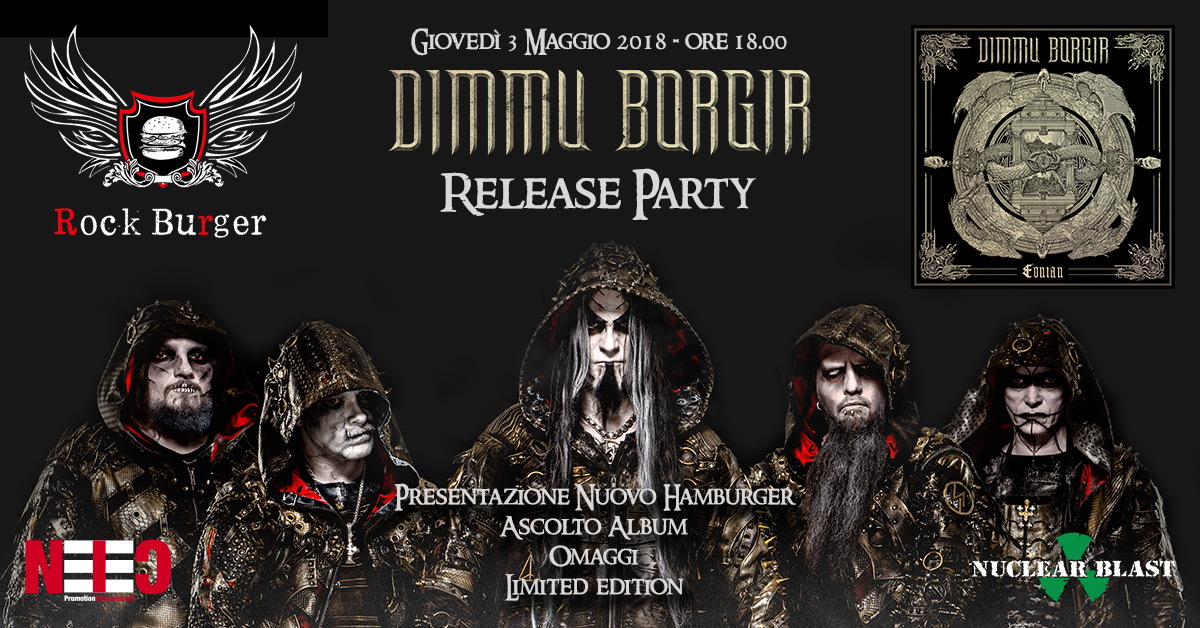 Dalle ore 18 sarà possibile ascoltare il nuovo album dei DIMMU BORGIR “Eonian” e dalle 19 verrà gustato il nuovo hamburger DIMMU BORGIR creato per l’occasione. Ma le sorprese non finiscono qui perché NeeCee Agency e Nuclear Blast regaleranno ai partecipanti poster, gadget autografati, vinili, CD e molto altro!
