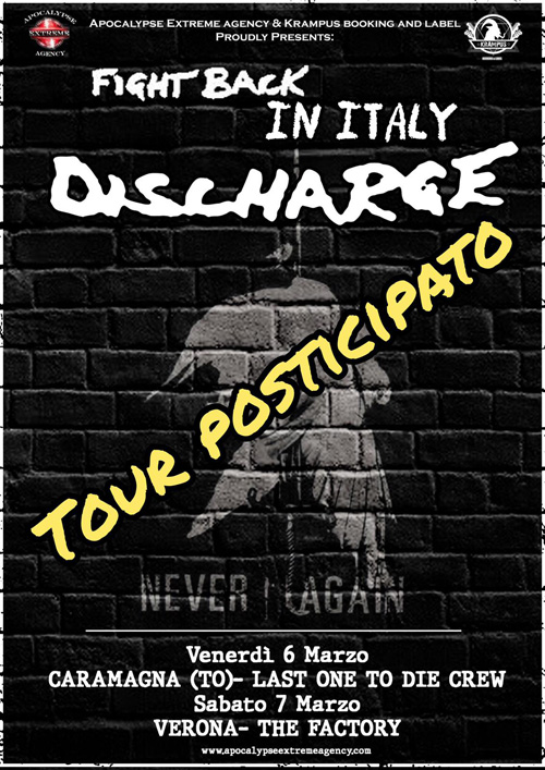 In ottemperanza al DPCM del 1 marzo in materia di Covid-19 (Coronavirus), comunichiamo che i concerti dei DISCHARGE previsti per Venerdì 6 Marzo a Caramagna (CN) e per Sabato 7 Marzo al The Factory di Verona sono rinviati a data da destinarsi.
