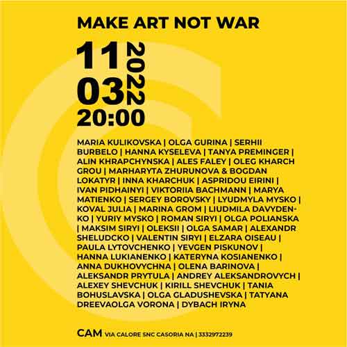 L’11 marzo 2022 a partire dalle ore 20.00, il Museo CAM ha programmato una manifestazione per la pace in Ucraina, con il sostegno di Enti, artisti e musicisti tutti uniti nel chiedere la fine dei bombardamenti. Una mostra con circa 50 artisti ucraini, che in queste ore stanno inviando le immagini delle loro opere da ogni parte dell’Ucraina, performance musicali, visive e la vendita delle immagini delle opere in mostra il cui ricavato sarà donato alla Comunità Ucraina di Napoli per l’acquisto di beni di prima necessità. Questo evento vuole esprimere la netta posizione del CAM, degli artisti visivi, dei musicisti ed in generale di tutti gli operatori delle arti e della cultura, di vicinanza a tutti coloro che soffrono a causa della guerra.