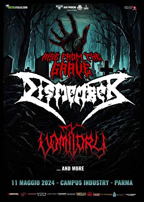 Continuano le conferme per il Rise From The Grave, evento dedicato alle sonorità estreme che si terrà l’11 maggio a Parma. Oltre ai già annunciati Dismember, saranno i Vomitory il secondo act chiamato sul palco del Campus Industry.La band capitanata dal chitarrista Urban Gustafsson ha pubblicato l’ultimo lavoro “All Heads Are Gonna Roll” (recensione qui) edito da Metal Blade nel 2023, viene accolto calorosamente dai fan per il ritorno sulle scene dopo il temporaneo scioglimento del 2018.