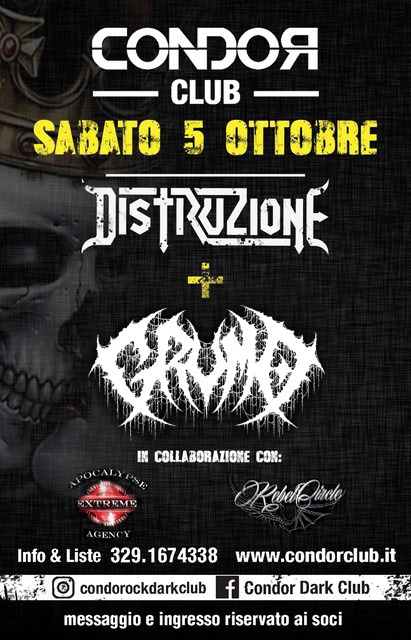 Sabato 5 ottobre, in occasione dell’inaugurazione della stagione 2019-2020 del Condor Dark Club di Rubiera (RE), i deathsters DISTRUZIONE saranno gli ospiti una serata speciale, con un live al fulmicotone che ripercorrerà tutta la storia della band, includendo inoltre i brani del loro ultimo EP “Inumana”.