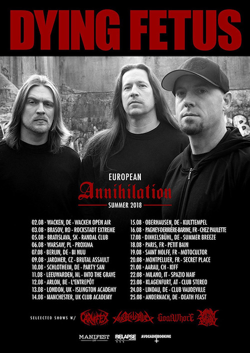 I Dying Fetus saranno in Europa nel mese di agosto, con al seguito i Goatwhore per il tour “European Annihilation Summer 2018”. Anche l’Italia è compresa nelle date riportate di seguito.