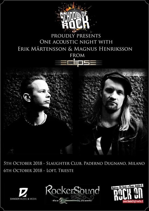 ROCKER SOUND AGENCY in collaborazione con SCHOOL OF ROCK è orgogliosa di presentare una bellissima serata tutta acustica; direttamente dalla Svezia Erik Martensson e Magnus Henriksson rispettivamente cantante e chitarrista dei melodici ECLIPSE , ci delizieranno con i più grandi successi della loro band in un repertorio allegro, energico e divertente che toccherà alcune capitali d’Europa e MILANO, più precisamente allo SLAUGHTER CLUB di Paderno Dugnano per una delle 2 date italiane del Tour.