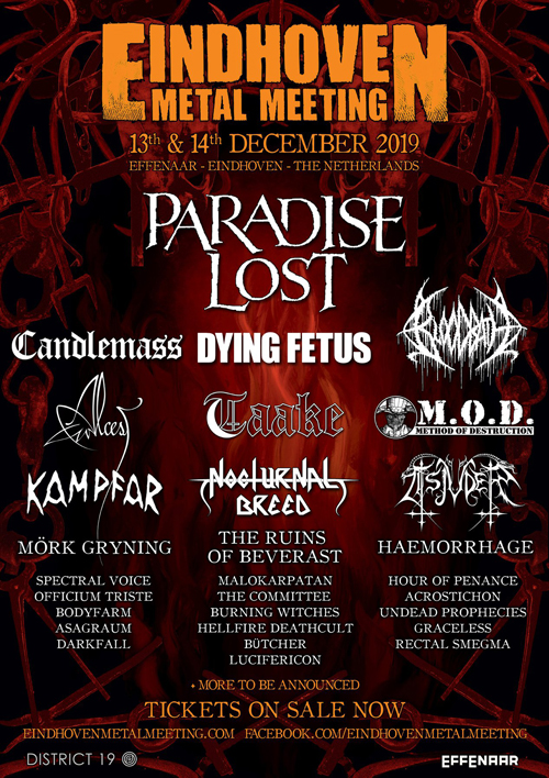 L’undicesima edizione dell’Eindhoven Metal Meeting avrà luogo nei giorni 13 e 14 dicembre 2019, sempre presso l’Effenaar Arena di Eindhoven (Olanda), location centralissima, a due minuti di cammino dalla stazione di autobus e treni, ottimamente servita da un’efficiente rete di trasporti pubblici attiva anche di notte e circondata da hotel per ogni tipo di tasca.