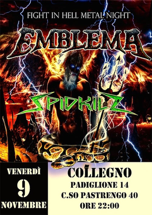 Organizza Diego “Glaze” Grandi venerdì 9 novembre al Padiglione 14 di Collegno (TO) un evento con gli Spidkilz ed Emblema. I primi sono guidati da Elisa “Over” De Palma, dopo una pausa dovuta al cambio di batterista che vede il nome di Riccardo Bazzinelli. Gli Emblema invece ritornano dopo sei anni di silenzio e una formazione rinnovata per l’ultimo disco “Fight In Hell”.