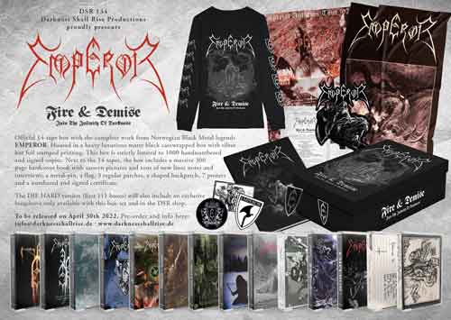 Impure Wedding Productions annuncia la pubblicazione di un cofanetto contenente l’intera discografia degli Emperor nel formato cassetta. Il box nero si intitola “Fire & Demise – Into the Infinity of Darkness” e al suo interno conterrà 14 cassette, oltre ad un libro di 300 pagine e diversi altri gadget. Il tutto in sole 1000 copie numerate a mano.