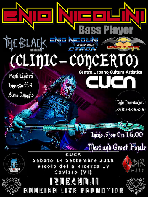 Irukandji Booking Live Promotion annuncia un clinic/concerto del bassista Enio Nicolini (Nicolini And The Otron, The Blacxk e altri). L’evento si svolgerà al CUCA, Centro Urbano Cultura Artistica in Vicolo della Ricerca 18 a Sovizzo in provincia di Vicenza il giorno 14 settembre.