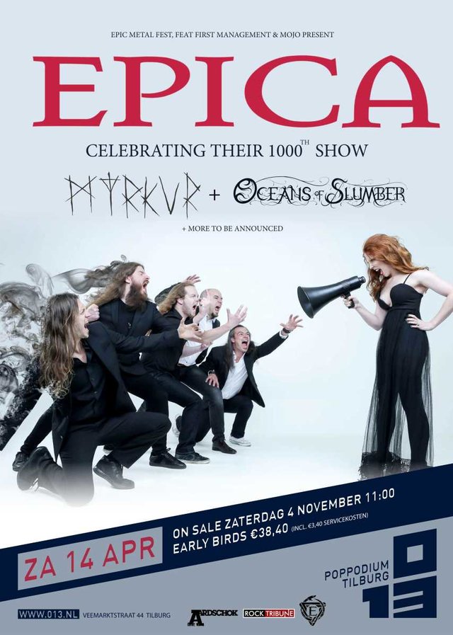 Sabato 14 aprile 2018 le icone del Symphonic Metal EPICA festeggeranno l’anniversario del loro millesimo concerto allo 013 di Tilburg, Olanda. Dopo i recenti show sold out in Olanda gli EPICA sono davvero orgogliosi di annunciare questo evento al leggendario 013, lo stesso luogo dove iniziarono sedici anni fa!