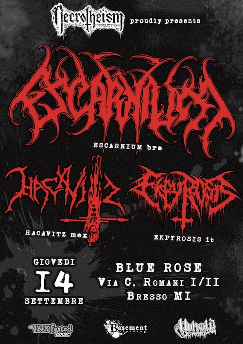 Il gruppo brasiliano Escarnium torna in Europa per un tour con i messicani Hacavitz. I primi, fautori di un death metal intenso, veloce ed estremamente oscuro, promuovono il loro recentissimo Inheritus, edito da Testimony Records; i secondi, tra i gruppi di punta dell’underground black/death internazionale più aggressivo, promuovono la loro ultima uscita Darkness Beyond, nel roster di Dark Descent Records.