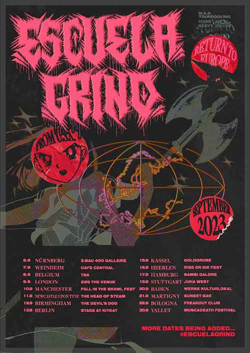 «Non ne abbiamo mai abbastanza dell’Europa, ormai è la nostra seconda casa e stiamo tornando per dimostrarvelo”, dice la cantante degli ESCUELA GRIND Katerina Economou. “Siamo davvero entusiasti di tornare con i leggendari Unearth e Napalm Death. È un onore, soprattutto fare due tour con i Napalm Death in un anno! Questa è la nostra prima volta in Spagna e Portogallo, e per noi è una cosa importante. È da molti anni che vogliamo spaccare le teste dei poser in quei paesi. Che le nostre New Balance e le nostre Nike possano calpestare le loro deboli ossa. Ave Escuela Grind. Ave, il vero Grind Hardcore Deathviolence Crossover. Questo è per le ragazze, i gay e i ragazzi».