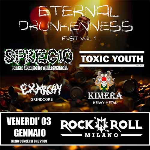 Ecco la prima edizione dell’Eternal Drunkenness Fest al Rock’n’roll di Milano e sul cui palco sfileranno i genovesi Sfregio, autori di un porno alcoholic thrash’n’roll esplosivo, attualmente in tour con il 5° album in studio “Malmignotta”. Con loro la nota band milanese di hardcore, Toxic Youth. In più i Kimera, heavy metal, e il grindcore anarchico dei Exarchy apriranno l’Eternal Drunkenness Festival. E a seguire ci sarà il DJ Set di Zeb Horseman.