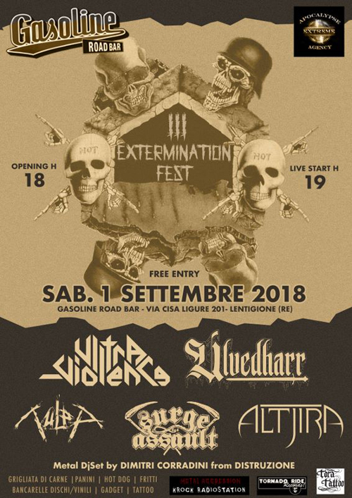 Gasoline Road Bar in collaborazione con Apocalypse Extreme Agency, sono orgogliosi di presentare la terza edizione del ”EXTERMINATION FEST”, che si terrà SABATO 1 SETTEMBRE, ad ingresso gratuito, presso il Gasoline Road Bar di Lentigione (RE).