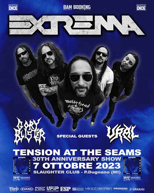 Saranno i veterani Gory Blister, storica death metal band milanese da poco sul mercato con l’ottimo e settimo album “Reborn From Hatred” su Eclipse Records, gli ospiti speciali del 30° anniversario dell’album “Tension At The Seams” targato Extrema. Il 7 ottobre allo Slaughter Club di Paderno Dugnano (MI) saranno i torinesi Ulver ad aprire l’evento, forti del nuovo album “Psychoverse” su Xtreem Music.