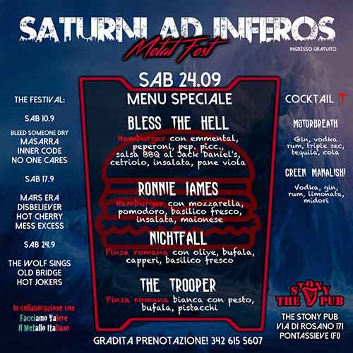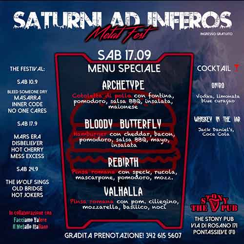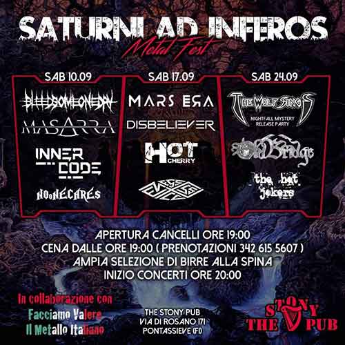 “Saturni ad Inferos”, tre sabati consecutivi per infuocare la dolce aria settembrina allo Stony Pub di Pontassieve (FI). Band esplosive rappresentanti varie branchie del nostro metal si alterneranno sul palco in questo nuovo minifestival marchiato Facciamo Valere il Metallo Italiano.