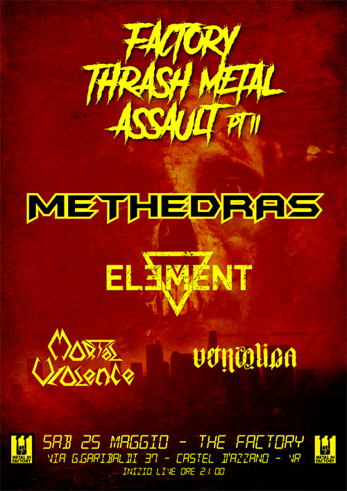 Prima di loro avremo i vicentini Element, autori di un thrash metal moderno e alternativo, i giovani ma inossidabili Mortal Violence e i Vetriolica per una serata da terapia intensiva e coma etilico!