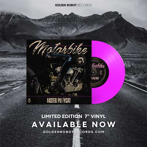 I fan saranno entusiasti di sapere che un 7 pollici in edizione limitata di “Motorbike” stampato su vinile “Pussycat Purple” è disponibile anche tramite Golden Robot Records. Per i collezionisti, un numero ancora più limitato di 7 pollici autografati da Taime Downe è disponibile esclusivamente su www.fasterpussycat.com.