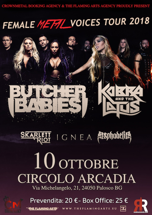KOBRA AND THE LOTUS – Dopo essere stati in tour lo scorso Novembre a Roma e Milano da Headliner tornano in italia come supporto diretto alle Butcher Babies, la band canadese capitana dalla potenza vocale e presenza scenica di Kobra Paige ad aprile ha pubblicato il suo quinto album “Prevail 2” per la Napalm Records, nel 2018 la band è stata in tour negli USA con i Texas Hippie Coalition e ha affrontato a Giugno un breve tour europeo come Headliner tra Spagna, Francia e Svizzera riscuotendo un ottimo successo per una band che sta crescendo in maniera esponenziale.