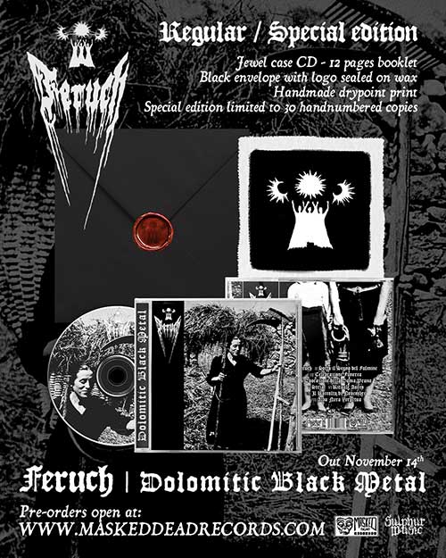 Il Dolomitic Black Metal di FERUCH è cantato in italiano e per fans di Djevel, Taake, Spite Extreme Wing, Beatrik ed Imago Mortis.