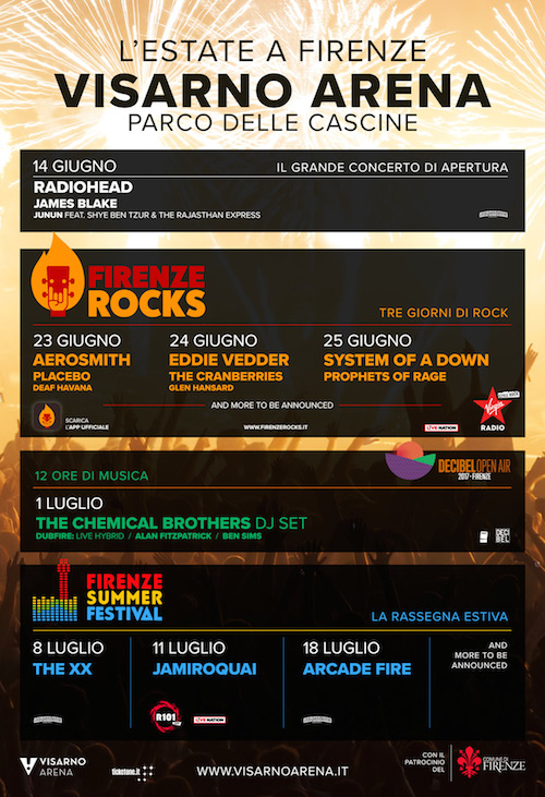 CAPIENZA, BIGLIETTI E PREVENDITE – Visarno Arena avrà una capienza di 50.000 spettatori e solo posti in piedi in occasione del festival Firenze Rocks (23 giugno Aerosmith, Placebo, Deaf Havana – 24 giugno Eddie Vedder, The Cranberries, Glen Hansard – 25 giugno System Of A Down e Prophets Of Rage) e del concerto dei Radiohead, James Blake e Junun (14 giugno). Per l’evento Decibel Open Air 2017 (1 luglio) e per i concerti di The XX (8 luglio), Jamiroquai, (11 luglio), Arcade Fire (18 luglio), oltre all’area parterre in piedi, saranno disponibili tribune con posti a sedere. La capienza per questi concerti sarà ridotta a 13.000 spettatori. I biglietti per Firenze Summer Festival e Firenze Rocks sono in prevendita su www.ticketone.it (tel. 892.101) e circuito Box Office. Per Decibel Open Air 2017 su www.diyticket.it. Sono ancora disponibili biglietti per tutte le serate.