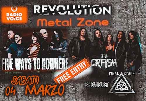 La rock band Five Ways To Nowhere ritorna in Veneto sabato 4 marzo sul palco del Revolution Live Club di Colceresa, in provincia di Vicenza. I rockers torinesi si esibiranno insieme ad una altro granitico quintetto, ovvero i toscani 17 Crash. Ad aprire la band friulana Final Stage.