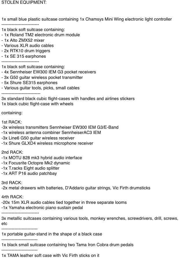 Ecco alcune foto degli strumenti rubati, compresa la lista completa dell’attrezzatura: