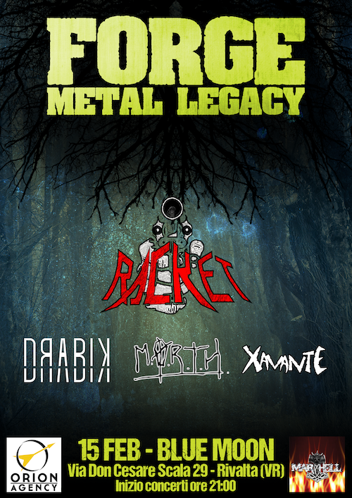 Venerdì 15 febbraio al Bluemoon di Rivalta Veronese, a pochi minuti dal casello Ala/Avio, si terrà il minifestival underground FORGE METAL LEGACY con band provenienti da Verona e da Trento organizzato da Orion Agency e dall’Associazione MartHell.