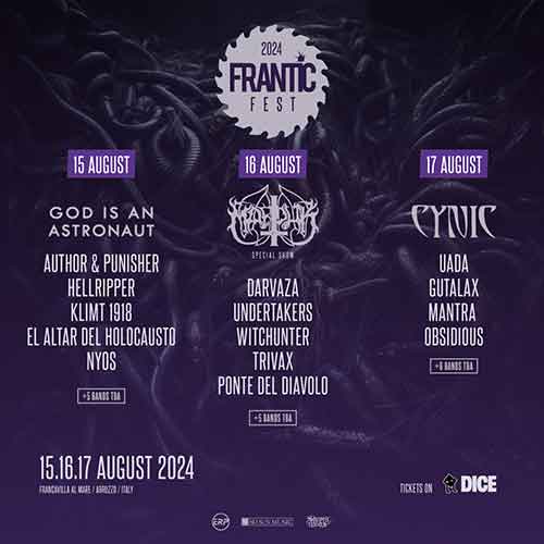 Ci sono ben sette nuovi nomi per l’edizione 2024 del Frantic Fest che si svolgerà il 15, 16 e 17 agosto presso il Tikitaka Village di Francavilla al Mare (Chieti). In cartellone arrivano i Marduk e non solo: Ponte Del Diavolo, gli Unbdertakers, Mantra, Nyos, Witchunter e El Altar Del Holocausto. Questi ultimi suoneranno in Italia per la prima volta.