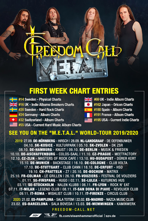 È uscito il nuovo album dei FREEDOM CALL intitolato “M.E.T.A.L.” (SPV/Steamhammer – Recensione qui). La band sarà in giro per il tour del 20° anniversario questo ed il prossimo mese, con ben quattro date in Italia, supportati dalla symphonic metal band australiana Visions of Atlantis ed i danesi Seven Thorns.