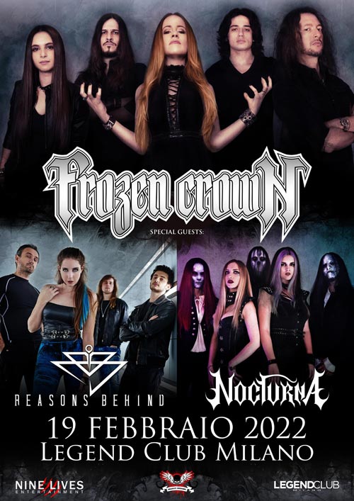 Inizialmente programmato per lo scorso 15 gennaio, il concerto di FROZEN CROWN, REASONS BEHIND e NOCTURNA è ufficialmente confermato per sabato 19 febbraio sempre presso il Legend Club di Milano.