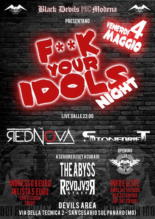 F**k your idols night è il nuovo punto di ritrovo per rockers e metalheads dell’ Emilia romagna e non solo, vede l’unione di Eagle Booking, Revolver Staff Modena e The Abyss per un unico scopo: mantenere vivo l’underground italiano e offrire metal parties di qualità con rotazione musicale a 360 gradi. La nostra tana ha sede al Devil’s Area di San Cesario sul Panaro, esattamente tra Modena e Bologna.