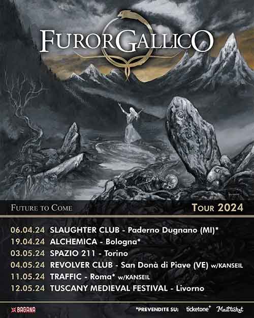 Tornano dal vivo i Furor Gallico, una delle realtà folk metal più interessanti di tutta la penisola, con il nuovo album “Future To Come” in uscita il 22 marzo 2024 per Scarlet Records. Sei i concerti italiani ad oggi confermati per la formazione: sabato 6 aprile 2024 a Paderno Dugnano (MI) presso Slaughter Club, venerdì 19 aprile a Bologna presso Alchemica, venerdì 3 maggio a Torino presso Spazio211, sabato 4 maggio al revolver Club di San Donà di Piave (VE), sabato 11 a Roma presso Traffic e domenica 12 maggio al Tuscany Medieval Festival di Livorno. A Roma e in provincia di Venezia in apertura KANSEIL, biglietti per tutti i concerti sono disponibili in prevendita sui circuiti ufficiali indicati in calce.