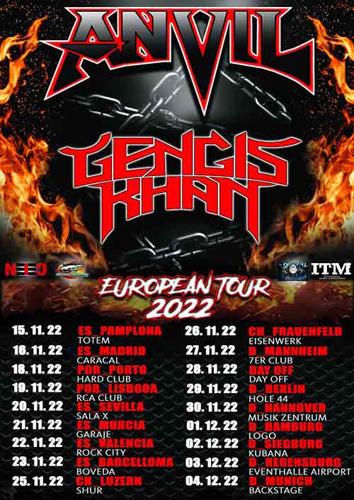 Gli heavy metaller italiani della vecchia scuola Gengis Khan sono lieti di tornare con una grande notizia. La band è orgogliosa di annunciare che parteciperà all’”Impact Is Imminent Tour”, di spalla agli Anvil. Il tour prenderà il via a Pamplona (Spagna) il 15 novembre 2022 e toccherà diciassette città in Spagna, Portogallo, Germania e Svizzera ma non l’Italia.