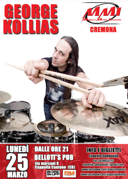 A causa di un grave problema familiare, il batterista di fama internazionale George Kollias (Nile) è stato costretto a posticipare al 25 marzo il seminario di batteria al Bellott’s Pub di Cappella Cantone (CR) organizzato da MMI Cremona.