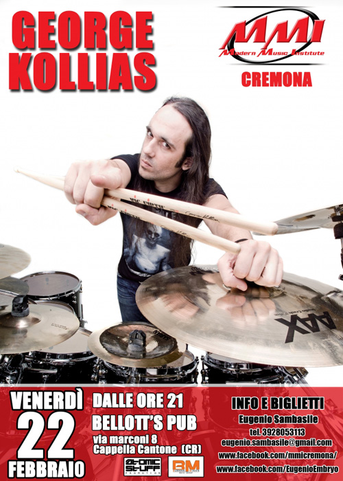In collaborazione con MMI Cremona, il batterista di fama internazionale George Kollias (Nile) si esibirà venerdì 22 Febbraio 2019 al Bellott’s Pub di Cappella Cantone (CR).