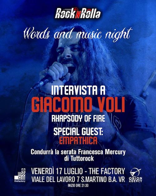 In collaborazione con Rocknrolla Eventi ed Orion Agency, il The Factory è lieti di presentarvi venerdì 17 luglio “Words and Music Night”: primo appuntamento sul palco del The Factory per questo interessante format dedicato ad artisti di livello nazionale. Ad esserne protagonista un artista del calibro di Giacomo Voli, che avrà l’occasione più intima di raccontare gli sviluppi della sua carriera ed eseguirà dal vivo una scaletta inedita di brani, per lui fonte d’ispirazione.