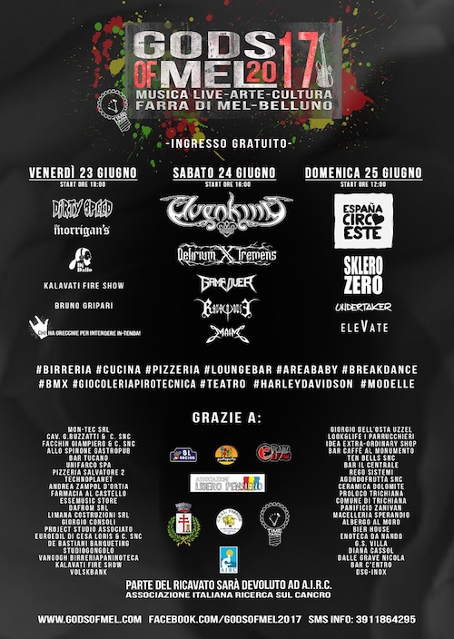 Anche quest’anno ritorna il GODS OF MEL, festival gratuito e a scopo benefico in memoria dell’amico musicista Omar De Paris. Il festival si terrà a Farra di Mel (BL) in Loc.Pian Del Toro. Venerdì 23 Giugno serata dedicata al fuoco con spettacoli di giocoleria pirotecnica con KALAVATI FIRE SHOW. Sul palco si esibiranno i giovani rocker DIRTY SPEED e i punkers MORRIGAN’S.