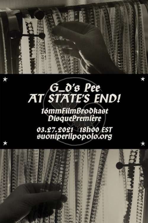I Godspeed You! Black Emperor invitano tutti alla presentazione in streaming del nuovo album “G_d’s Pee AT STATE’S END!” il 27 marzo alle 22. I GY!BE infatti diffonderanno un film concerto attraverso una proiezione curata da Karl Lemieux e Philippe Leonard in 16mm al Cinema Impewrial di Montréal. La proiezione consiste in una serie di bobine con delle immagini sulel quali sono montate le note del nuovo album della band.