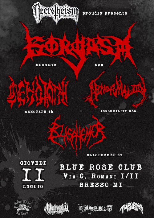 Ecco i dettagli della data milanese di Gorgasm, Cenotaph, Abnormality e Blasphemer di giovedì 11 luglio.